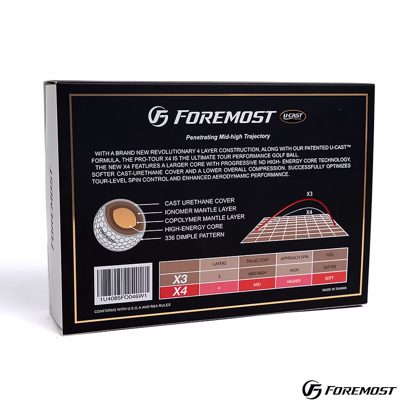 With a brand new revolutionary 4 layer construction, along with our patented U-CASTâ„¢ formula, the PRO-TOUR X4 is the ultimate tour performance golf ball. The new PRO-TOUR X4 features a larger core with progressive and High-Energy core technology, softer cast urethane cover and a lower overall compression. Successfully optimizes Tour-Lever spin control and enhanced aerodynamic performance.